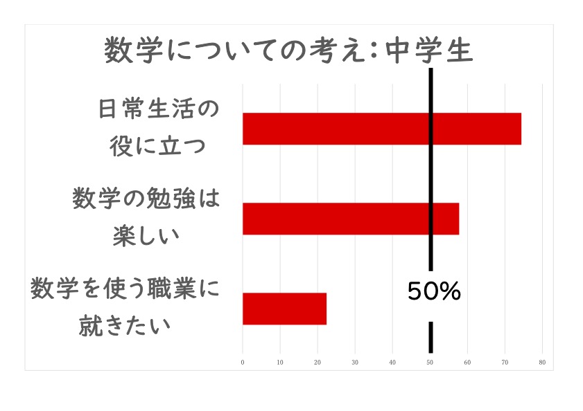 前にも紹介したことがありますが、日本の子どもたちは国際的にみると平均して学力が高いけれど、勉強そのものは好きではない傾向があるようです。この図(下記図1、昼礼でも見せました)はある国際調査で中学生に聞いた結果です。数学が日常生活の役に立つと思っている人は70%以上いますが、数学の勉強が楽しいという生徒は約5割、数学を使う仕事に就きたいと思う生徒は20%ちょっとで、これは国際的に最も少ないようです。これをそのまま読めば数学は生活の役に立つと思う生徒が多くて、悪くない結果と言えそうです。しかしこれにはちょっと微妙な点もあるようです。もしかすると中学生の多くは『数学は受験に役に立つ」と思っていて、それを日常生活で役に立つに含めて答えているのかもしれないとみることもできるかもしれません。