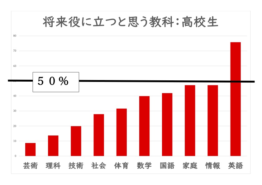 図2は高校生に学校の教科で将来役に立つと思うものを挙げてもらった調査の結果です。50%を超えたのは英語だけで、あとの教科は役に立たないと思っているひとの方が多いということです。数学も4割くらいですから、先に見た調査の印象とはかなり違います。